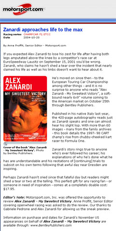 Information on purchase and dates for Zanardi's November US appearances on behalf of Alex Zanardi - My Sweetest Victory are available through: www.BentleyPublishers.com